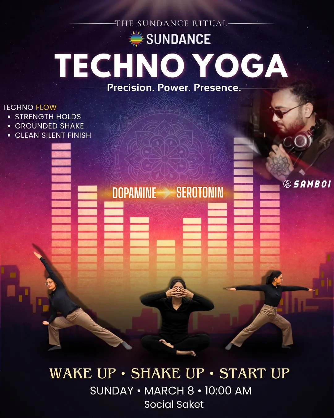 Immerse yourself in strength holds, grounded shakes, and a clean silent finish powered by live beats from DJ Samboi.